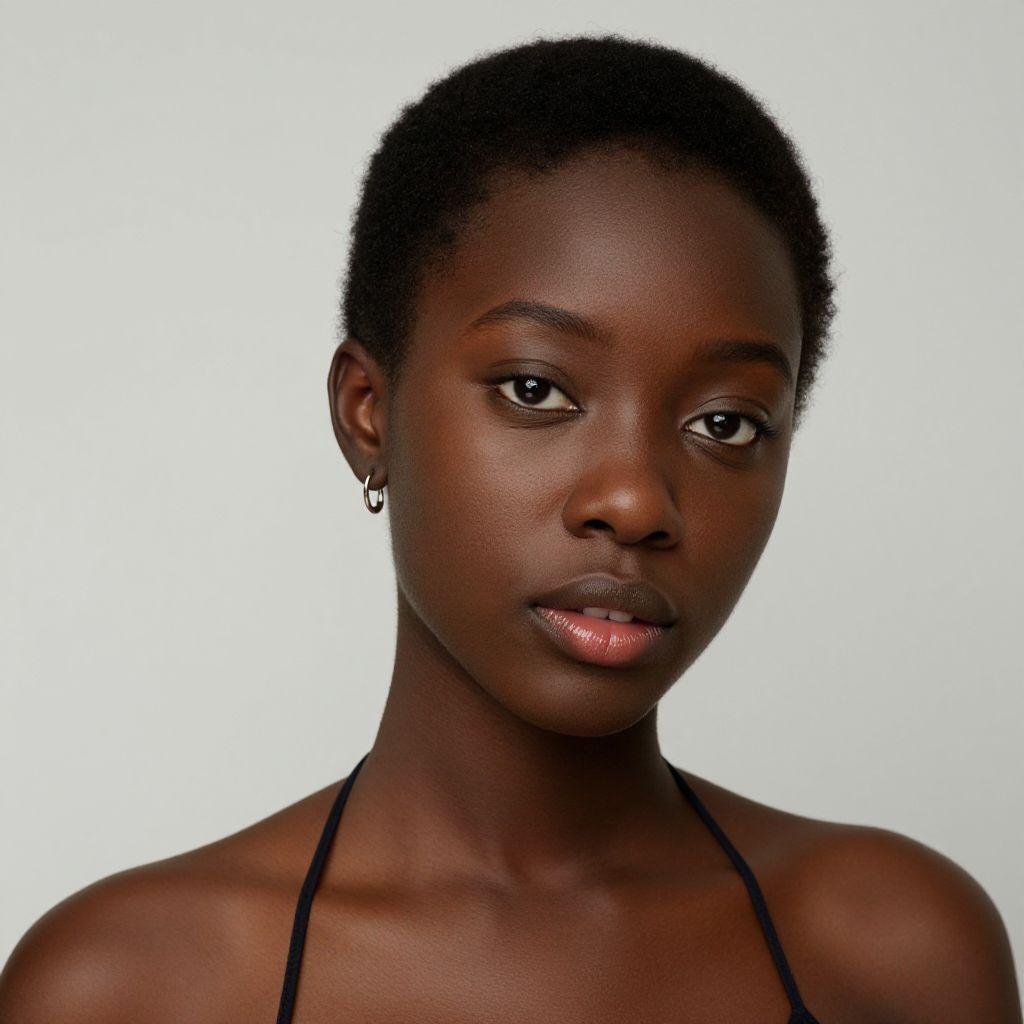 Photograph of a young, dark-skinned Black woman with short, natural curly hair, standing against a plain white background. She has a smooth, glossy complexion, full lips with a subtle shine, and is wearing a small, black hoop earring in her left ear. Her black halter top has thin straps visible over her shoulders. She gazes directly at the camera with a calm, confident expression. The image is well-lit, highlighting her features and skin texture, and has a clean, minimalist style. The focus is sharp, emphasizing her facial details and upper body.