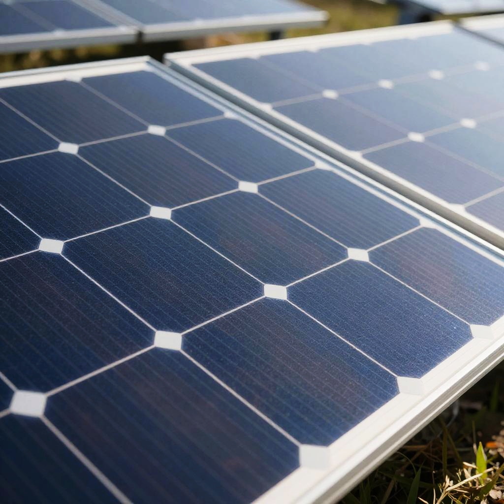 Close-up of PV cells on a modern solar panel, showcasing intricate nanotechnology and crystalline structures, under vibrant daylight. The image highlights efficiency and innovation in solar energy solutions with a sleek, high-tech aesthetic.