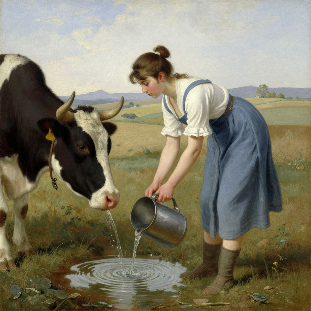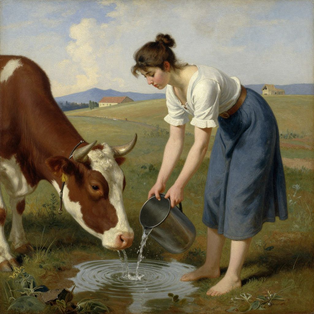 Realistic painting of a young woman in a white shirt and blue skirt pouring water from a pot into a cow's drinking trough in a grassy,