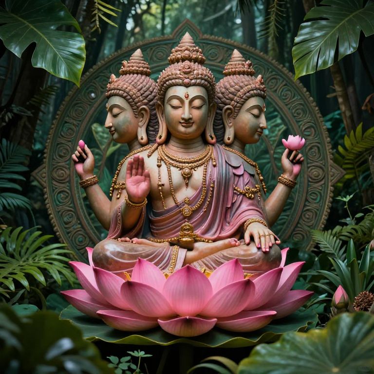 Topology triple-headed lord brahma with three heads on pink lotus in a DMT jungle mandala with leafs all around. hyperdetailed. psychedelic. vignette. 30mm. leafs all around.,