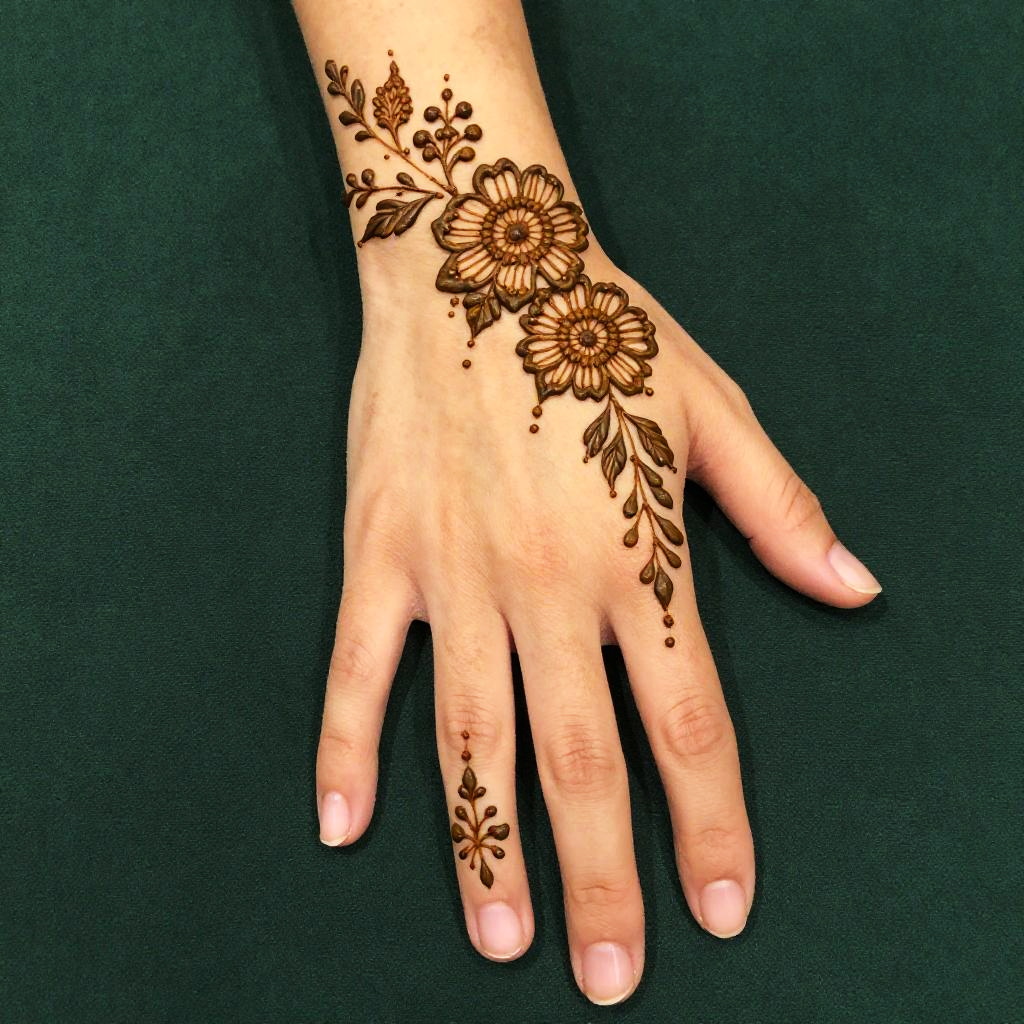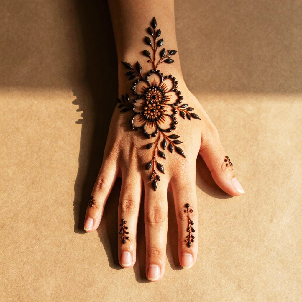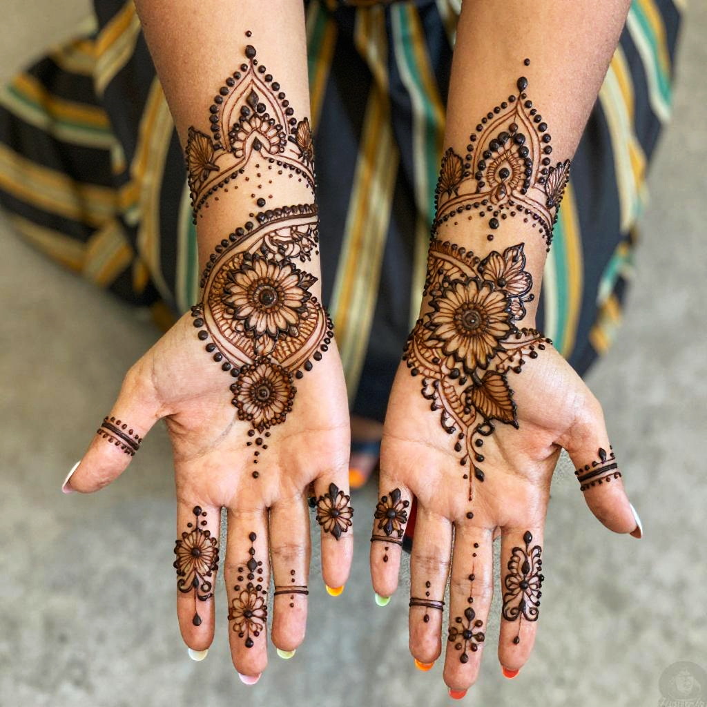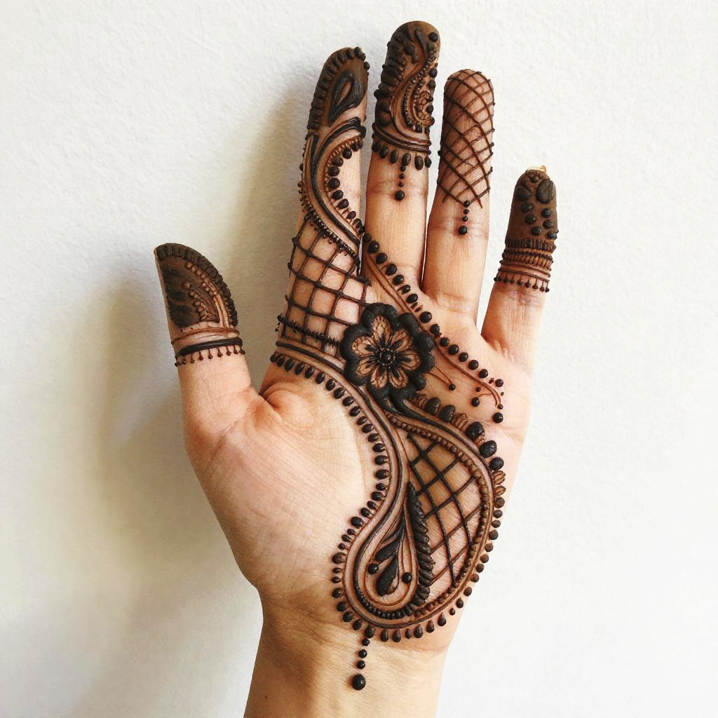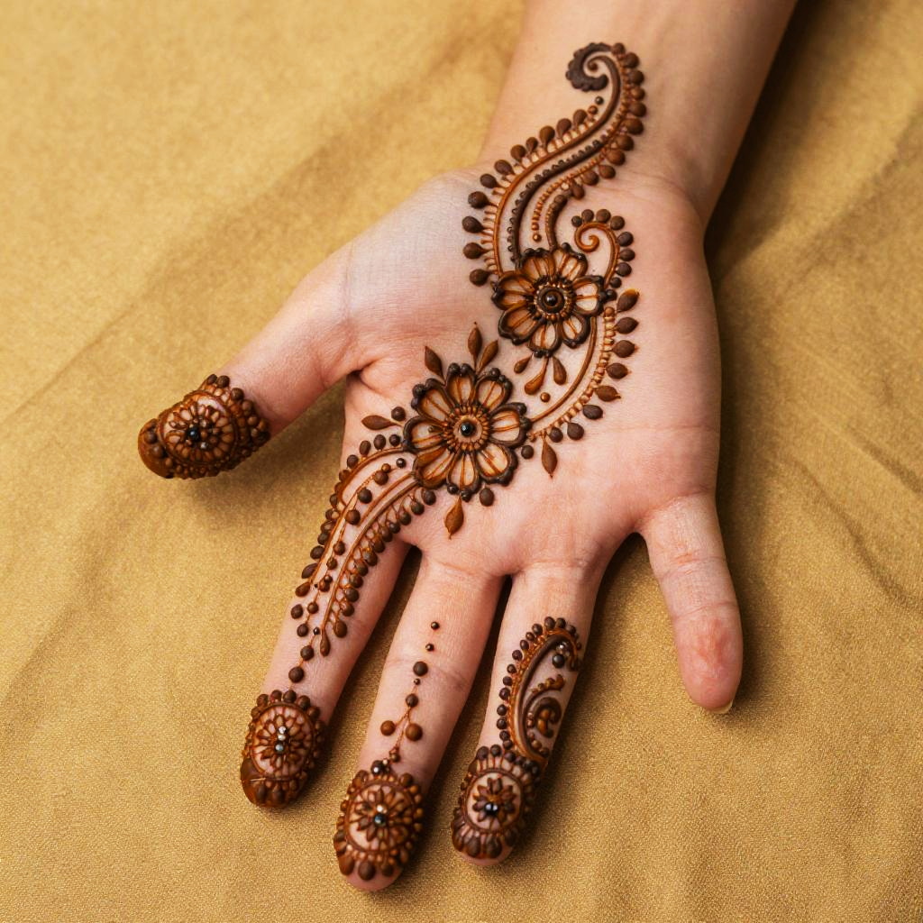 Photograph of a light-skinned hand with intricate, dark brown henna patterns covering the palm and fingers. The designs feature floral and paisley motifs with small beads scattered throughout. The hand is resting on a golden-brown fabric, providing a warm background. The henna appears freshly applied, with a rich, dark color and fine, detailed lines.