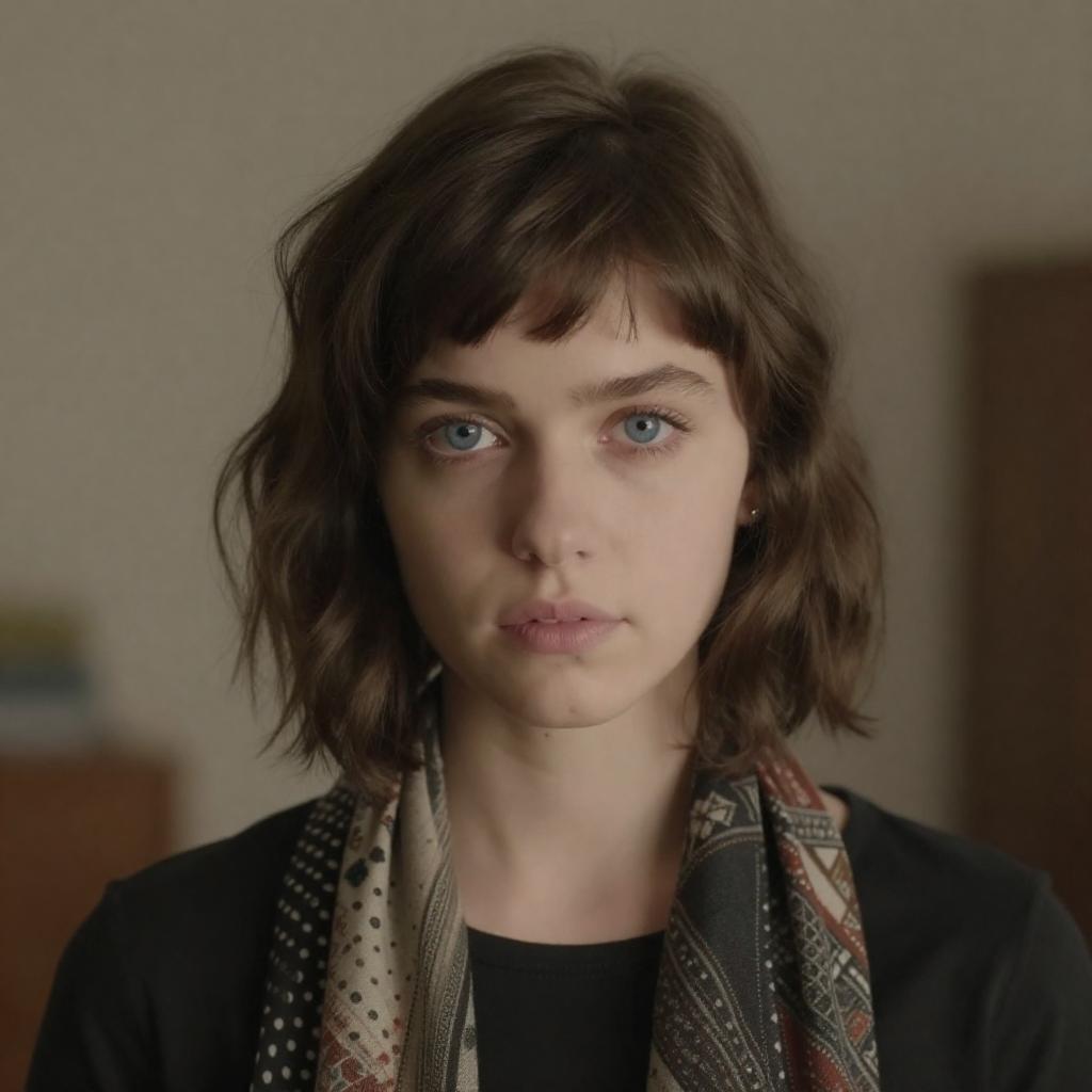 Close-up of a young woman with pale skin, dark brown shoulder-length hair, and brown eyes. She wears a brown coat over a white shirt. Background shows two blurred people in brown and beige clothing. She has a neutral expression.