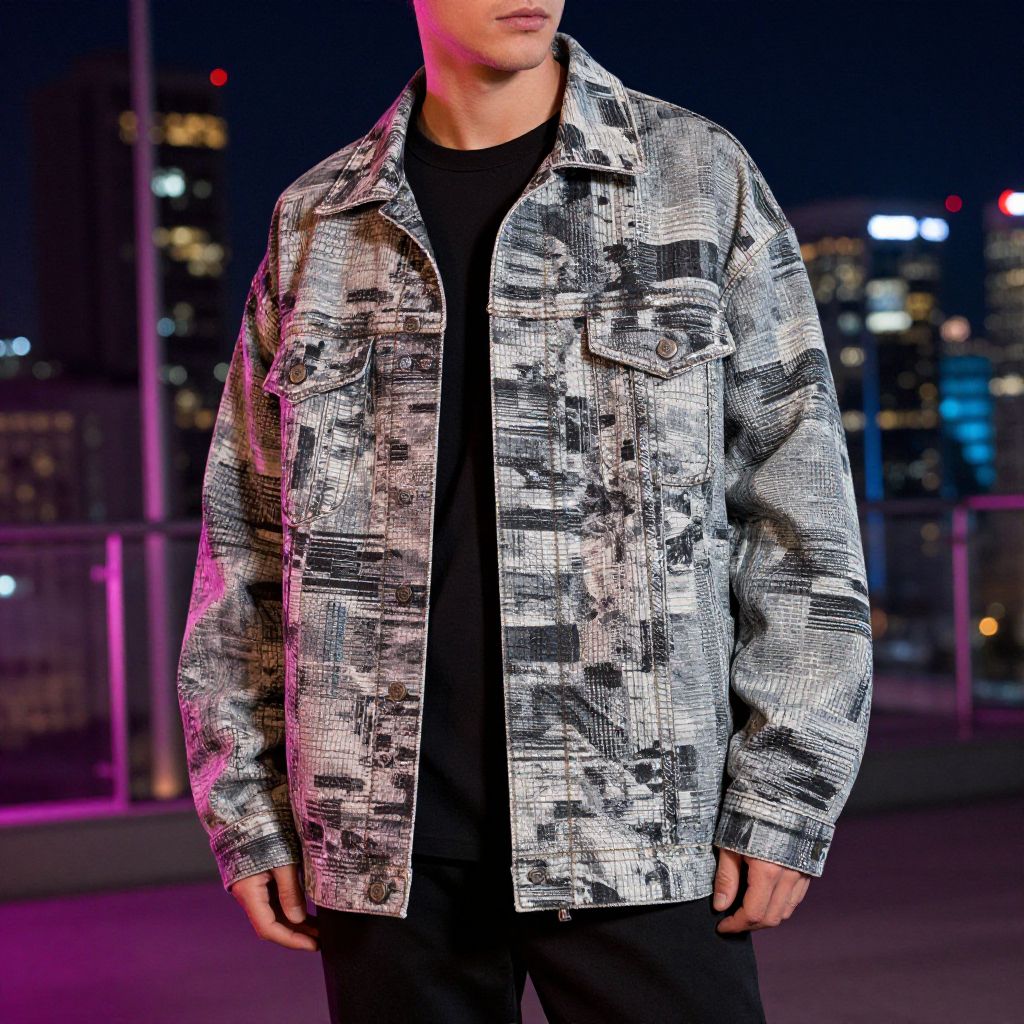 Statement jackets for men, european man, abstract art patterns, oversized silhouette, layered textures, urban explorer aesthetic, neon city lights reflection, dynamic angle, high-resolution fashion capture