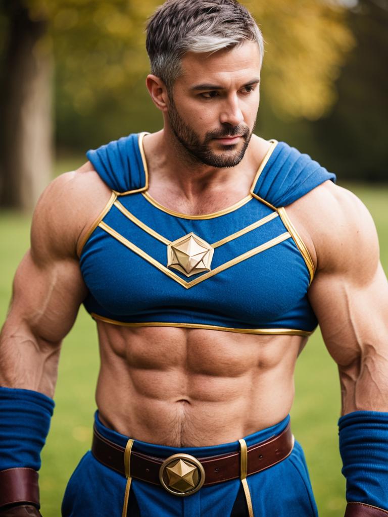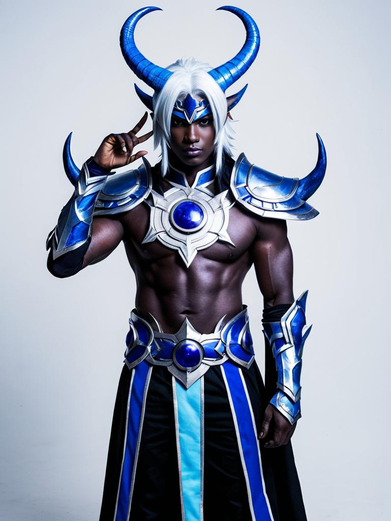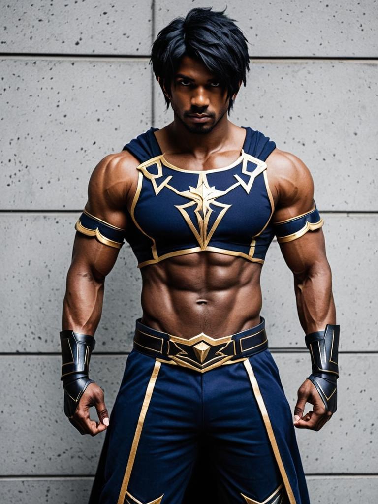 Photo-realistic cosplay photo of person in arash (fate) costume. 1boy, dark-skinned male, black eyes, black hair, short hair, muscular male, bara, abslifestyle stock photo, shallow depth of field, lifestyle stock photography, shallow depth of field, natural lighting, warm tones, soft background blur, candid moments, vibrant colors, realistic textures, modern casual clothing. full body shot