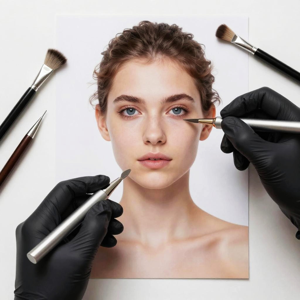 Remove tattoos from photos, concept of digital transformation, photo editing tools surrounding a clear portrait, natural skin restored flawlessly, emphasis on photo retouching art, crisp details, soft shadows