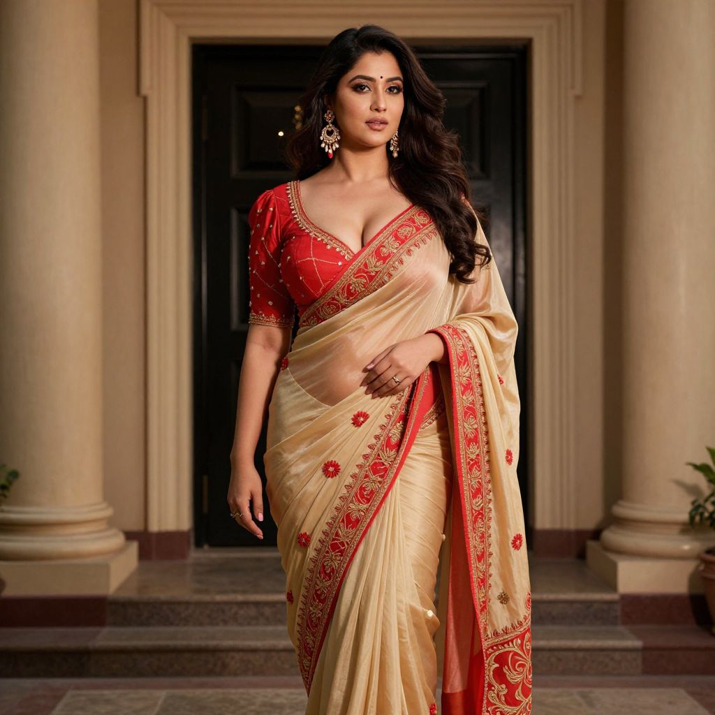 A beautiful woman with long flowing hair and a curvy figure is wearing a vibrant beige and red saree adorned with intricate red and gold embroidery, highlighting her elegant silhouette. She has big tits and is visibly sexy, standing confidently in front of a grand building with towering columns and a sleek black door. The setting is richly detailed, with warm lighting casting soft shadows, enhancing her allure and the opulent atmosphere of the scene. The woman's expression is serene yet captivating, drawing the viewer's gaze with her charm and grace.