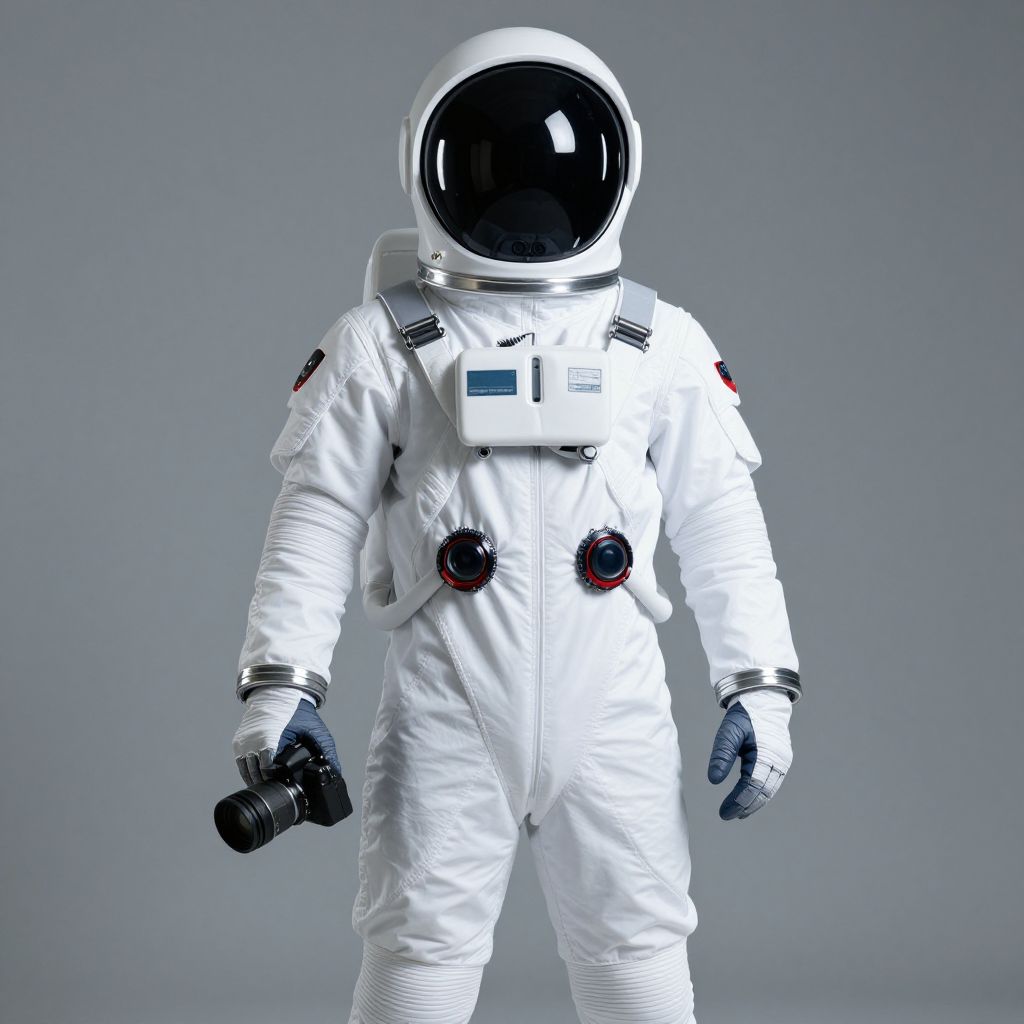 Scifi Space Suit Costume, man in a space suit with a camera in his hand