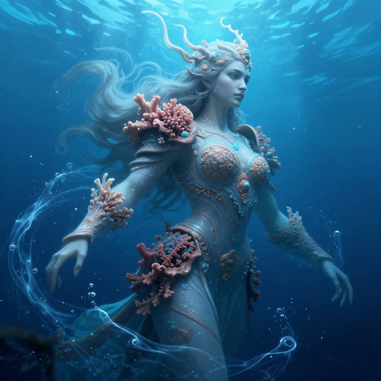 Digital CGI artwork of a underwater mermaid with ethereal blue hues. She has flowing, wavy hair and wears an ornate, metallic armor adorned with coral and gemstones. Her armor covers her shoulders and chest, accentuating her large breasts. She has a serene expression and wears a crown with horns. The background is a deep blue ocean, with light beams filtering down. Bubbles surround her, and her arms and dress are depicted with a sense of movement. Her skin is pale, and her overall appearance is majestic and mystical.