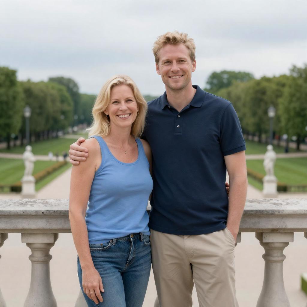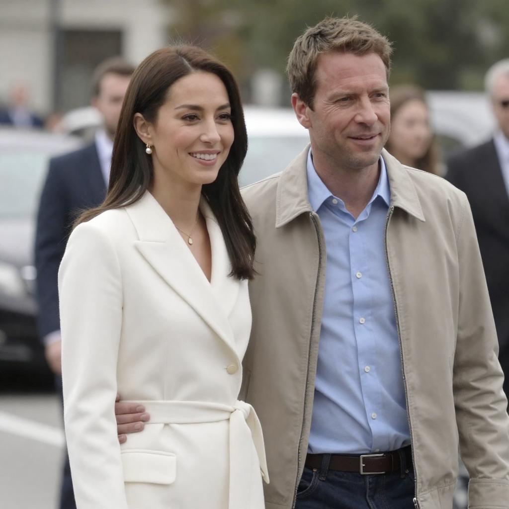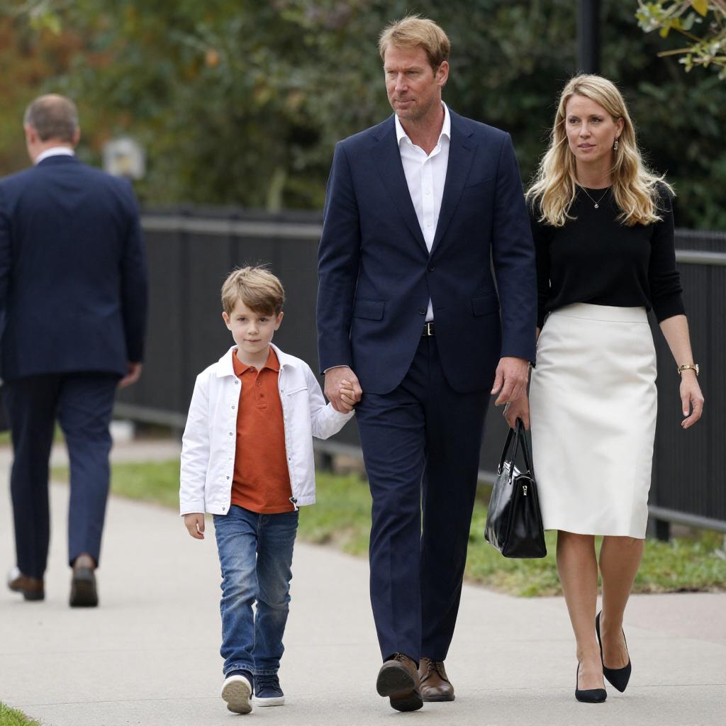 Photograph of a family walking outdoors. A man in a dark blue suit and white shirt holds hands with a young boy in a white jacket and orange shirt. A blonde woman in a black top and white skirt walks beside them, holding a black bag. Background includes greenery and a fence.