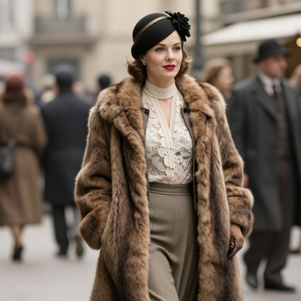 Elegant French woman in 1930s fashion strides confidently down a bustling street, adorned in a luxurious fur coat with a matching hat, complemented by a detailed lace blouse and a tailored suit beneath, exuding sophistication amidst the vintage urban backdrop.