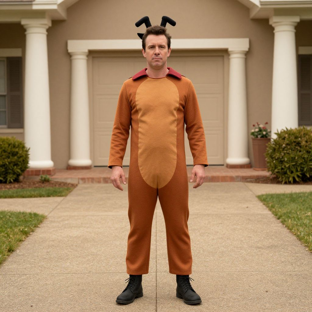 Photograph of a Caucasian man standing on a concrete driveway in front of a beige suburban house with white columns. He wears a full-body, orange, velvety Bugs Bunny costume with black bunny ears on his head, black shoes, and black collar with red lining. His expression is neutral, and he stands with arms relaxed by his sides. The background includes a garage door, windows with brown shutters, and green shrubs. The lighting is bright, suggesting daytime. The overall scene has a humorous, cosplay-like quality.