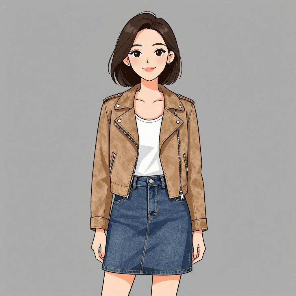 Woman with pretty face and pretty hair. smiling Woman, casual chic, tan suede jacket with shoulder patches, asymmetrical zippered front, white scoop-neck tee underneath, A-line denim skirt with front button closure, mid-thigh length. --sref 1467