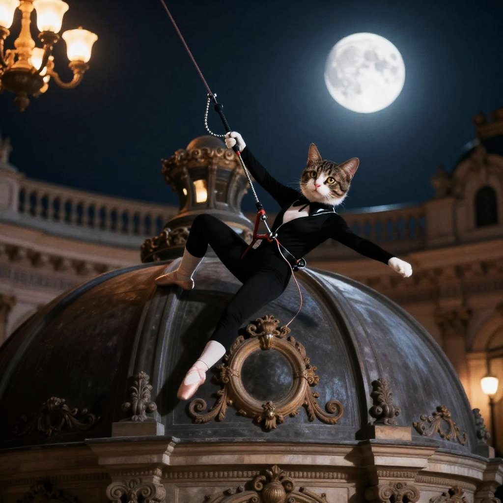 Dynamic scene of a daring ballerina cat burglar using a grappling hook to scale a ornate opera house dome under a moonlit night with warm chandelier glow.