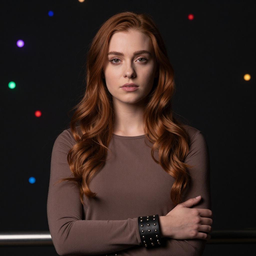 Photograph of a young woman with long, wavy, auburn hair, wearing a brown, long-sleeved shirt with black, studded cuffs. She stands against a dark, starry background with colorful, out-of-focus lights. She gazes softly at the camera, her right arm crossed over her chest, left hand resting on her right arm.