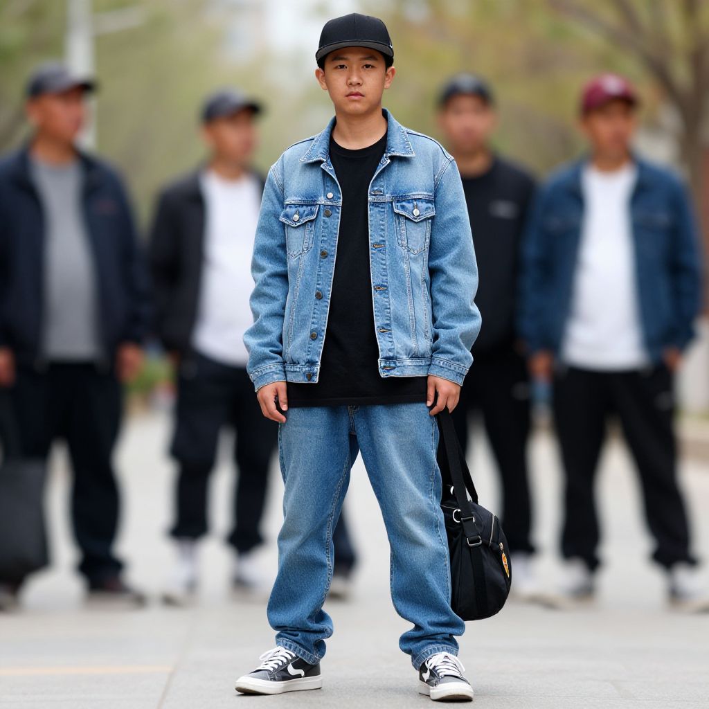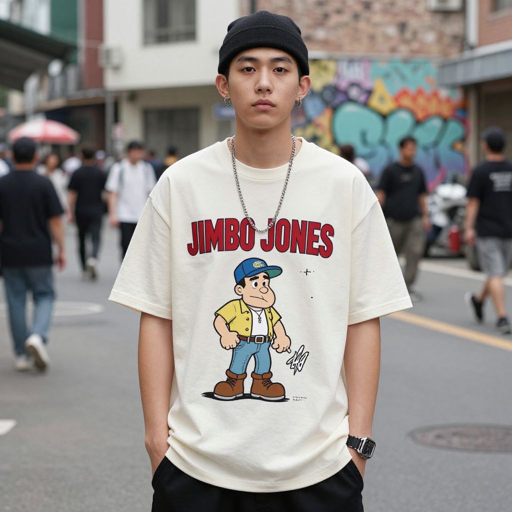 A stylish young adult wearing a Jimbo Jones shirt on a busy city street, combining classic cartoon motifs with modern hip-hop clothing aesthetics and graffiti walls in the background.