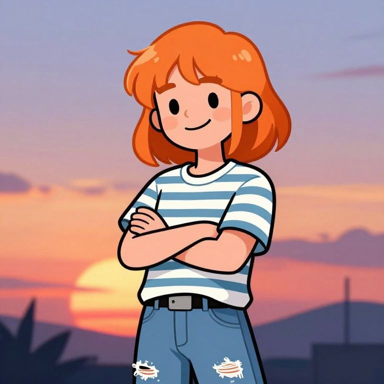 Digital cartoon of a smiling, orange-haired girl with crossed arms, wearing a striped shirt and ripped jeans, against a colorful sunset background.