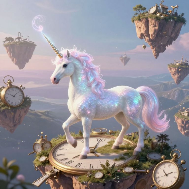 Visualize an enchanting digital artwork, reminiscent of surrealist visions, portraying a mythical unicorn gracefully traversing through a whimsical landscape composed of intertwining timepieces and levitating islands. This ethereal creature is adorned with iridescent scales that shimmer under the soft, diffused light and a mesmerizing spiraling horn that radiates an otherworldly glow. The scene unfolds from an aerial perspective, highlighting the unicorn's regal presence against the dreamlike backdrop, which evokes a sense of enchantment and contemplation in this captivating and imaginative tableau.
