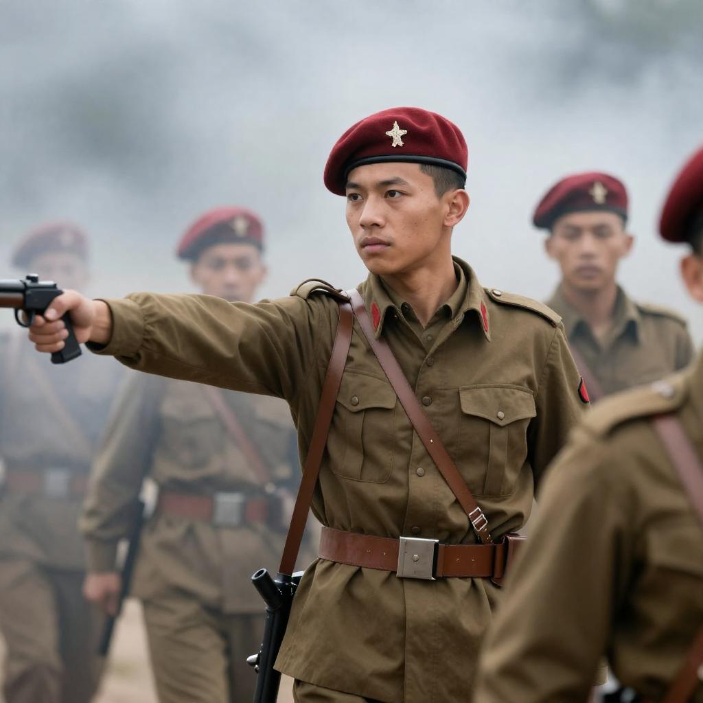Photograph of a young man in a red beret and military-style jacket, leading a group of soldiers with rifles. He extends his arm forward, eyes focused ahead. The background is filled with smoke, and other soldiers are partially visible, creating a sense of urgency and movement.