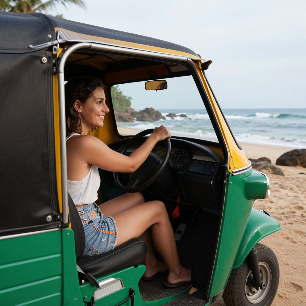 Smiling woman driving a vibrant yellow-green tuk-tuk along the sandy shores of Mirissa, Sri Lanka, with the ocean and rocky coastline visible through the open window.