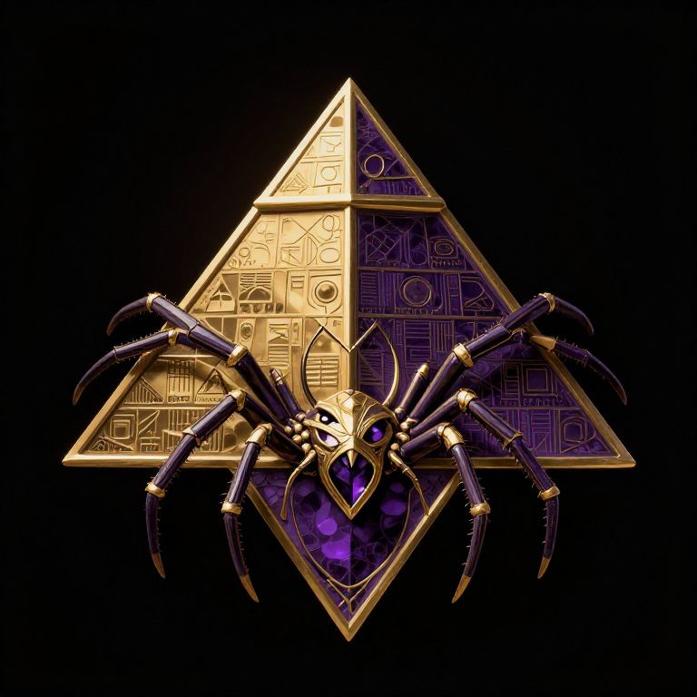 A digital CGI artwork depicting a golden, intricately patterned, triangular symbol with Egyptian hieroglyphs on a black background. In the center, a large, detailed spider with dark purple, segmented legs and a heart-shaped, purple gem on its chest, adorned with gold accents, sits perched on the symbol. The spider's eyes are prominent and reflective, adding a sense of depth and realism. The combination of gold, purple, and black creates a striking, mystical contrast. The overall style is futuristic and symbolic.