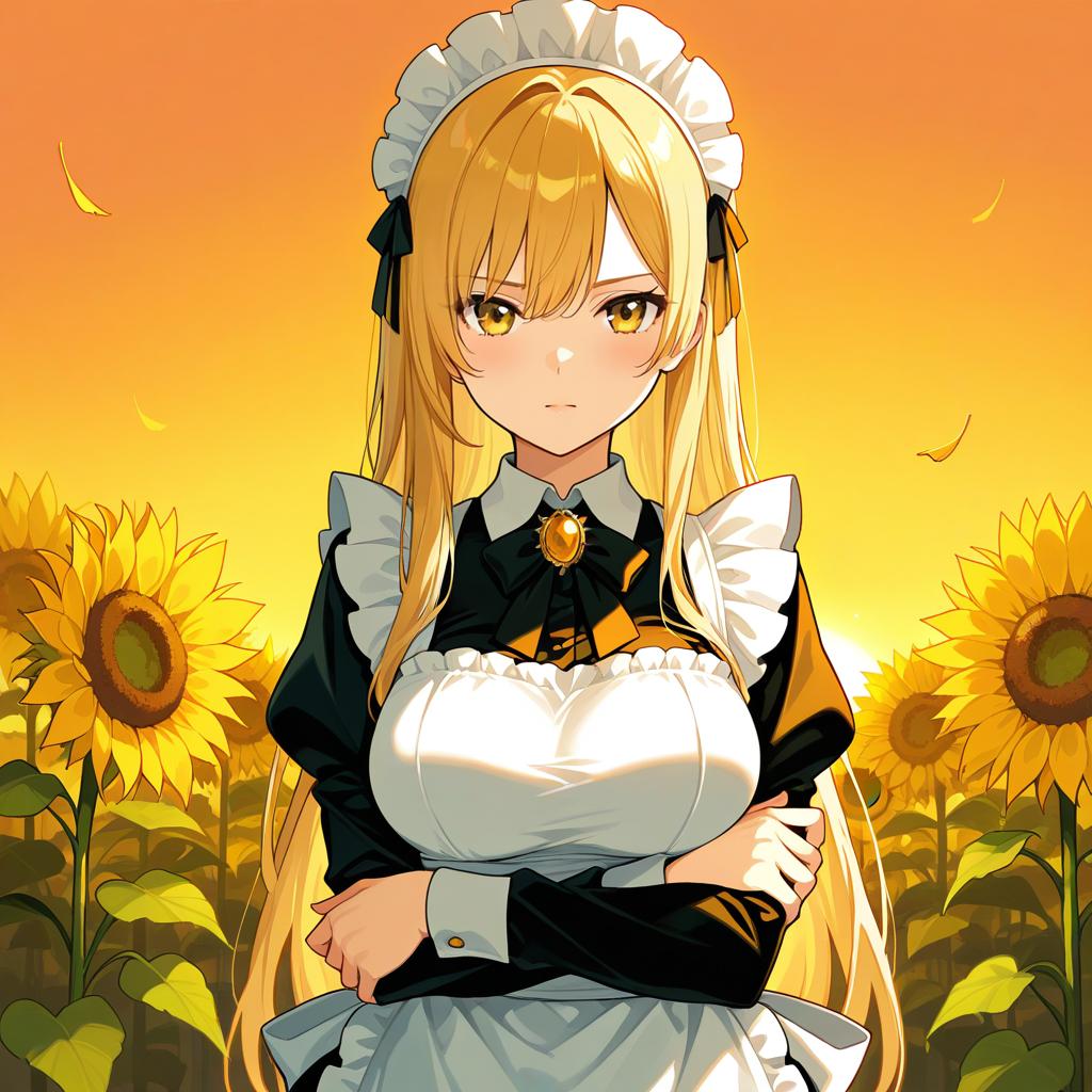 1girl, apron, blonde hair, bow, breast hold, breasts, brooch, closed mouth, crossed arms, dress, dusk, enmaided, evening, frown, ginkgo leaf, gradient, gradient background, long hair, long sleeves, looking at viewer, maid, maid apron, maid headdress, medium breasts, orange background, orange sky, orange theme, ribbon, solo, sunflower, sunset, v-shaped eyebrows, white apron, yellow background, yellow sky, yellow theme