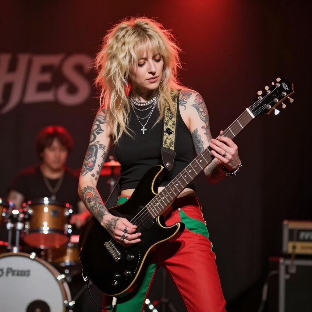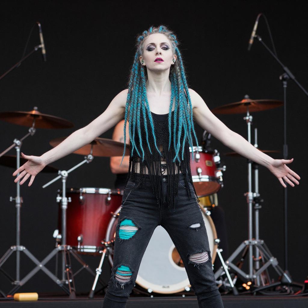 A woman with pale skin and blue-green dreadlocks performs on stage. She wears a black, fringed, sleeveless top and ripped black jeans with teal patches. Her hands are outstretched, and a drum set with a red bass drum is in the background. The stage is illuminated with bright lights.