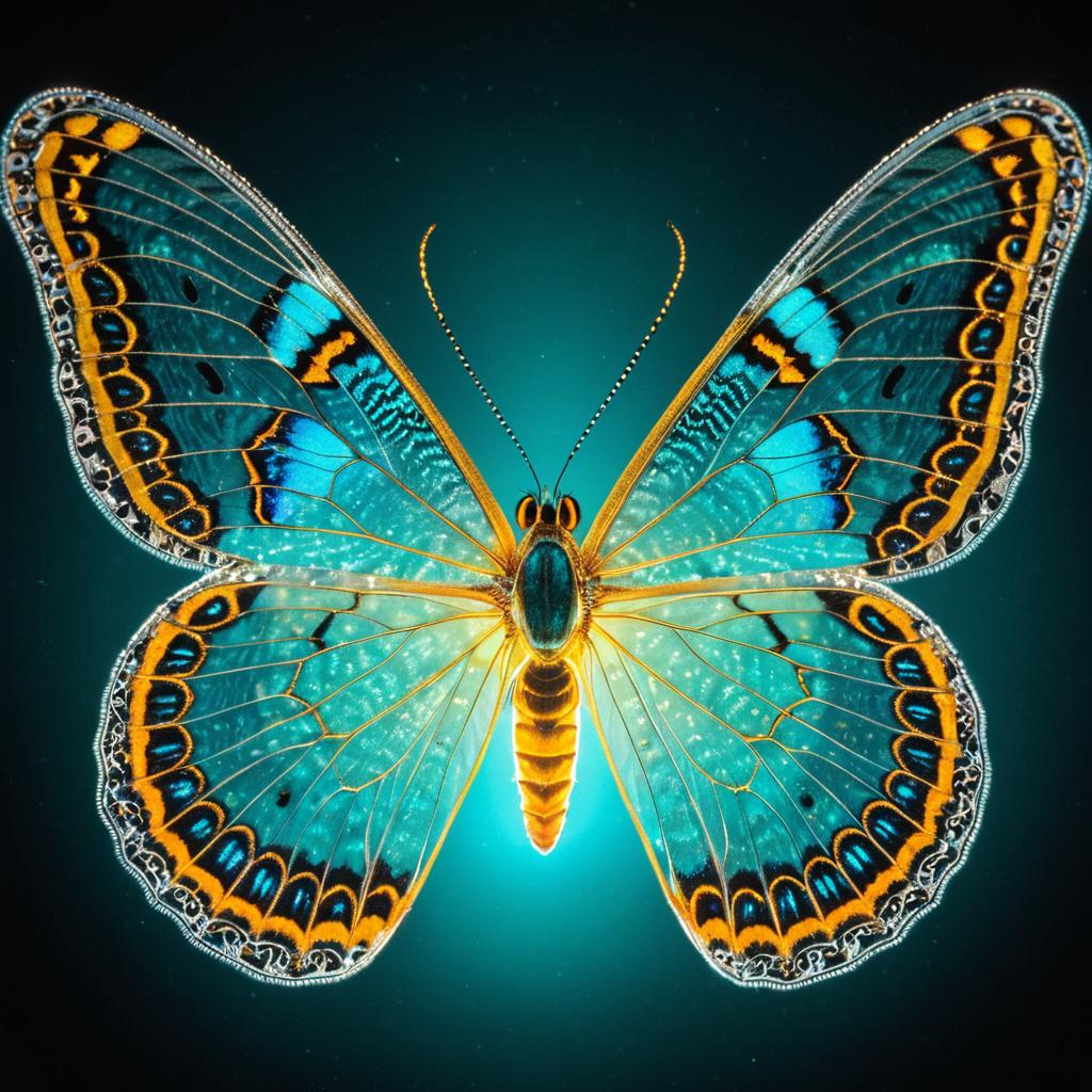 A digitally rendered ethereal butterfly glowing with translucent turquoise and amber hues. The butterfly features intricate lacewing patterns on its wings and bright amber eyes, highlighting a fusion of natural beauty and technological artistry. The vibrant glow and delicate details create a mesmerizing visual effect against a dark background.