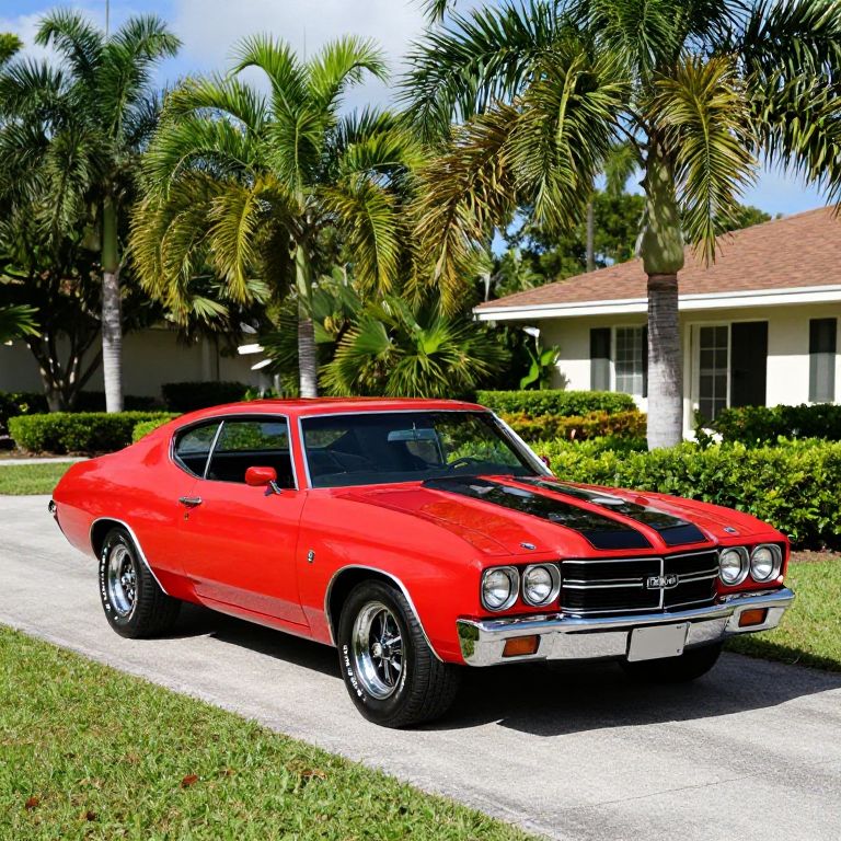Shiny red 1971 Chevrolet Chevelle SS (CC-1359020), featuring a black hood stripe and chrome accents, is parked gracefully on a paved driveway surrounded by lush green palm trees and manicured hedges in sunny Fort Myers, Florida.