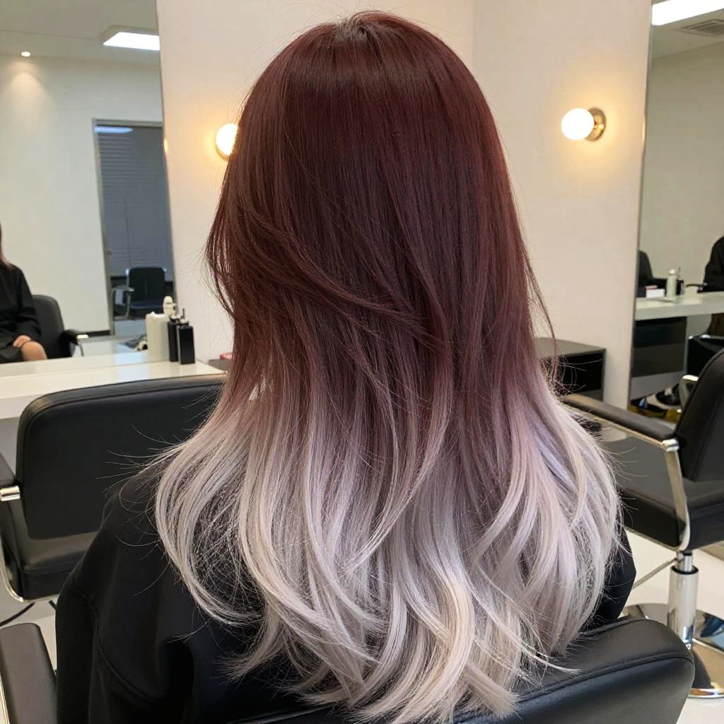 Change hair color in picture to a gradient ombre effect transitioning from deep mahogany to shimmering silver, with fine detail on individual hair strands and soft shadows, framed by a cozy indoor studio setting with warm ambient light.