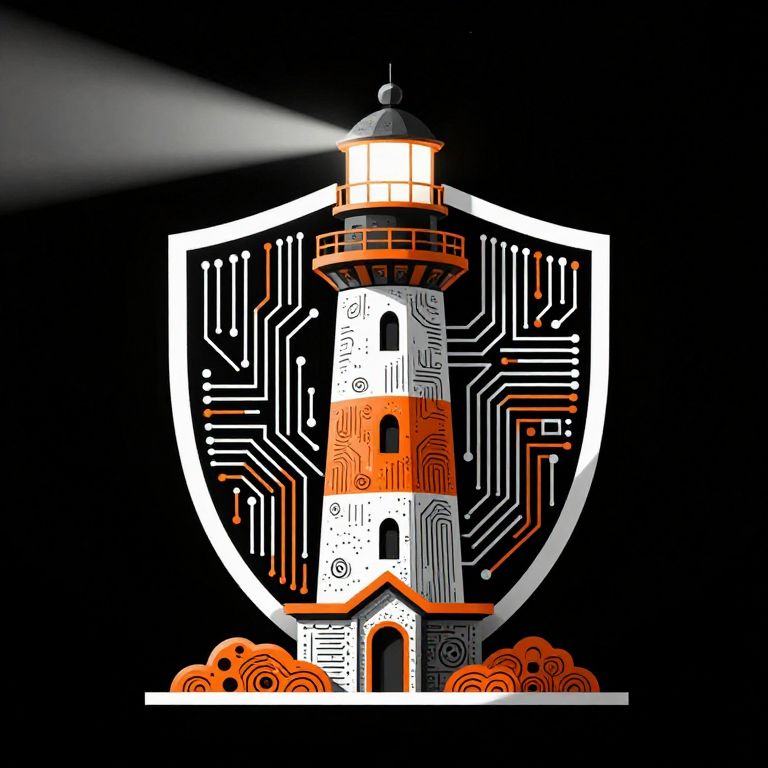 The image presents a striking digital illustration of a lighthouse and its foundation, both crafted from intricate circuit-like elements to evoke a futuristic, cyber-focused vision. The lighthouse, a central figure, stands tall with a bright horizontal beam of light piercing through the darkness, symbolizing visionary leadership. Surrounding the lighthouse is a shield made of digital circuits, representing cybersecurity. The color palette conveys strength, guidance, trust, and innovation, with a mix of bold black, white, and vibrant orange hues. The lighthouse and its foundation are meticulously designed with a variety of shapes and textures, including straight lines, curves, and circular patterns, creating a sense of depth and dimension. The overall composition is balanced, with the lighthouse and shield positioned centrally, drawing the viewer's eye to the core elements of the image. The interplay of colors, textures, and shapes enhances the visual richness and structural composition, making the image a powerful representation of innovation and security in a digital age.