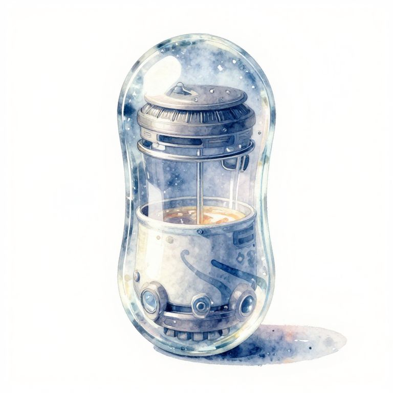 Watercolor-style digital illustration of a clear, cylindrical glass jar with a domed lid, housing a complex mechanical device with gears and wires inside.