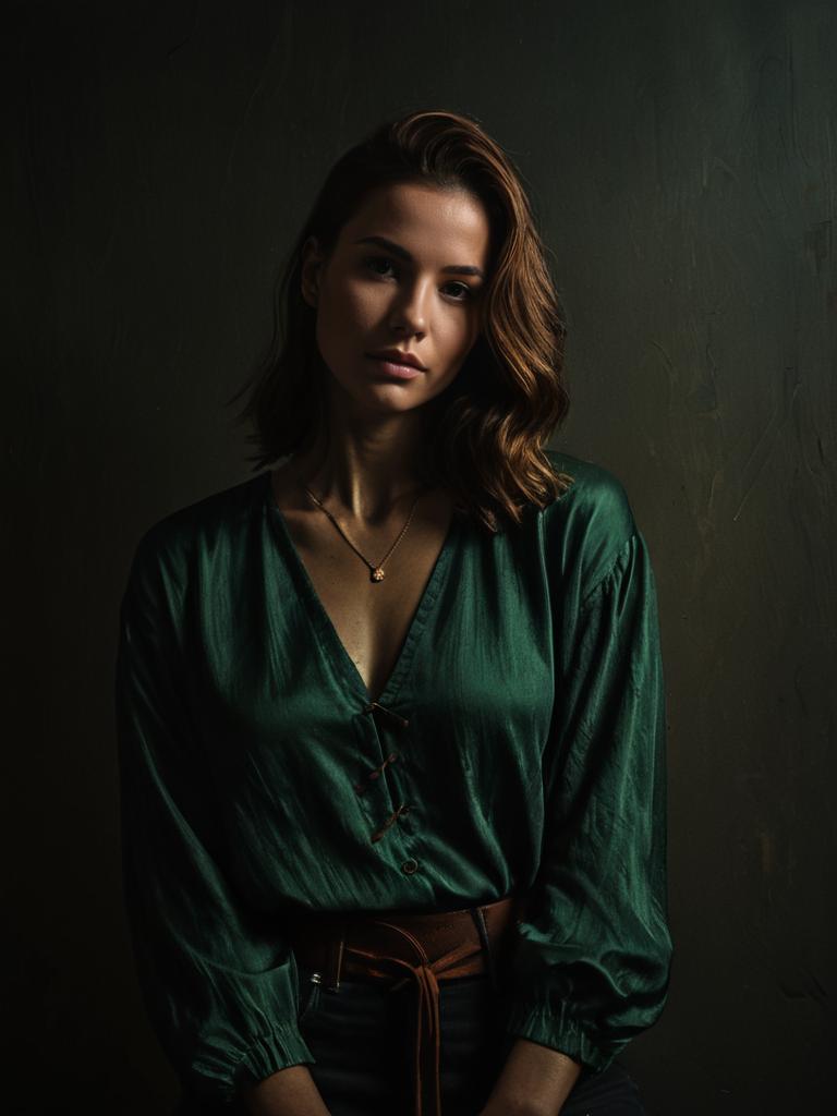 Close-up portrait of a young woman with medium-length brown hair wearing a green button-up shirt layered with a brown knit cardigan. She is accessorized with a simple necklace and standing against a dark textured background. The lighting is low-key, highlighting her facial features and creating a moody atmosphere.
