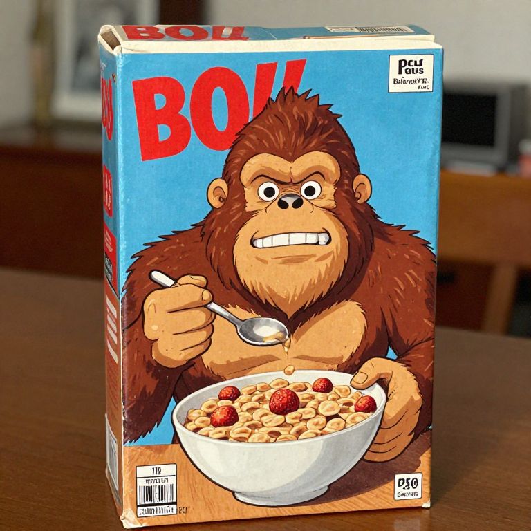 Fashion Consultant a vintage 50’s cereal box featuring a cartoon Sasquatch mascot eating cereal, weird,