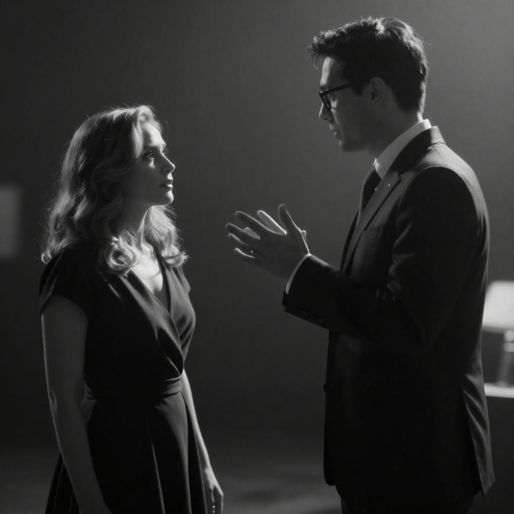 Black-and-white photograph of a man and woman in a dramatic, low-light setting. The man, with short dark hair and glasses, wears a suit and gestures with his right hand. The woman, with wavy light hair, gazes up at him, wearing a dark dress. The background is blurred, with faint light patterns. The man's face is in shadow, highlighting the woman's illuminated expression.