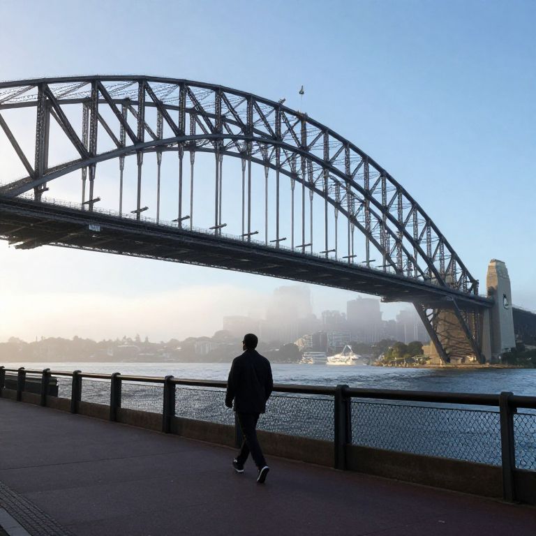 Photograph of a person in dark clothes walking beside Sydney Harbour Bridge, with a misty cityscape and blue sky in the background.