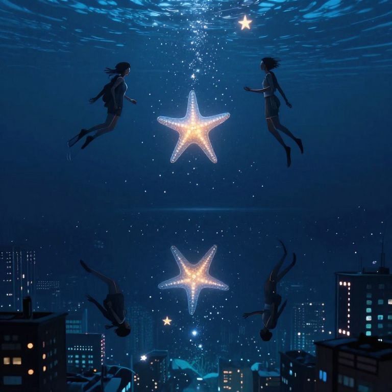 Digital art: Two silhouetted girls underwater, floating towards glowing starfish, mirrored reflections, cityscape below with lit buildings and twinkling stars