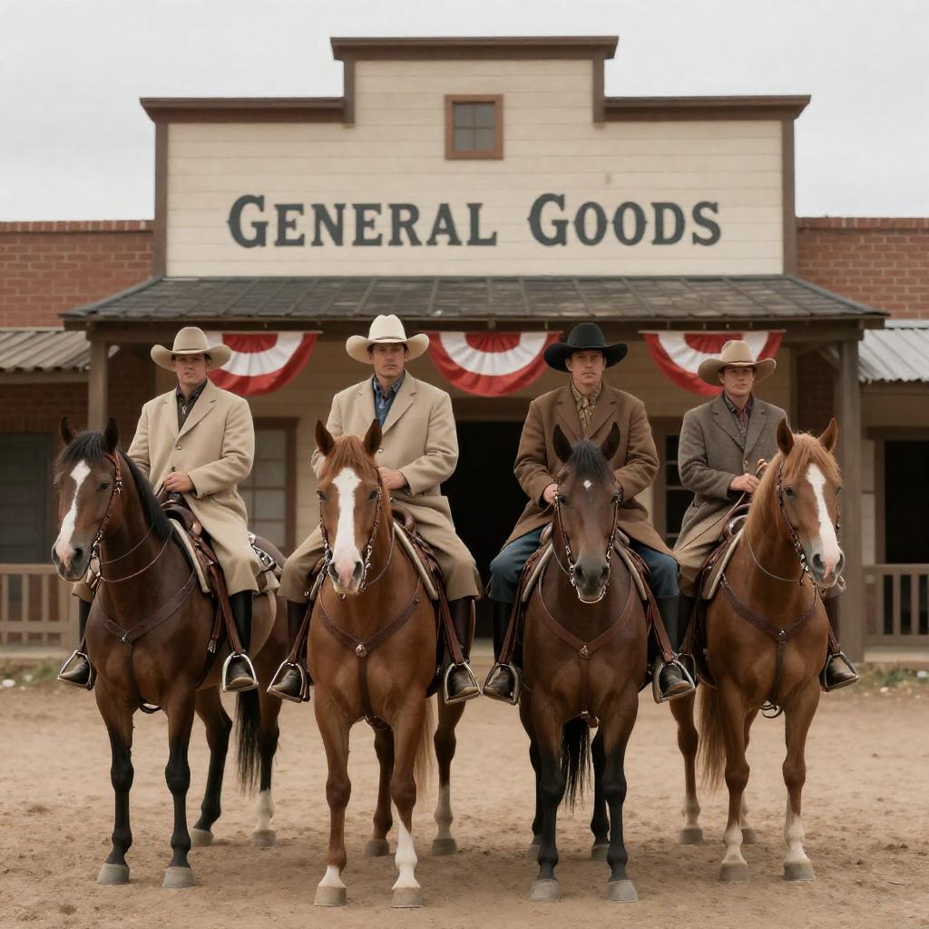 Western photograph. Four men in cowboy hats and vests, three riding horses, one standing. Central man pointing, intense expression. Background: bare trees, mountains, clear sky. Sunlight casting shadows. Rural setting. Faces: serious, focused. Horses: centered, right, left.