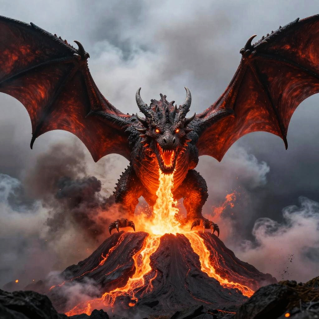 Lava breathing in a fantasy setting, a fierce warrior exhales molten lava streams from their mouth, dynamic fiery glow, intense heat waves, volcanic background with erupting lava flows, dark rocky terrain, epic atmosphere, high detail