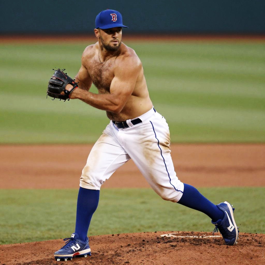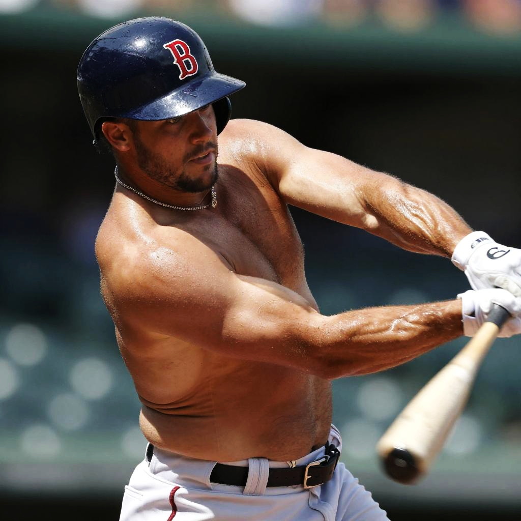 Mike Trout shirtless, dynamic baseball portrait with motion blur, showing off strong physique and athleticism, photo-realistic detail, vivid natural lighting, energetic vibe