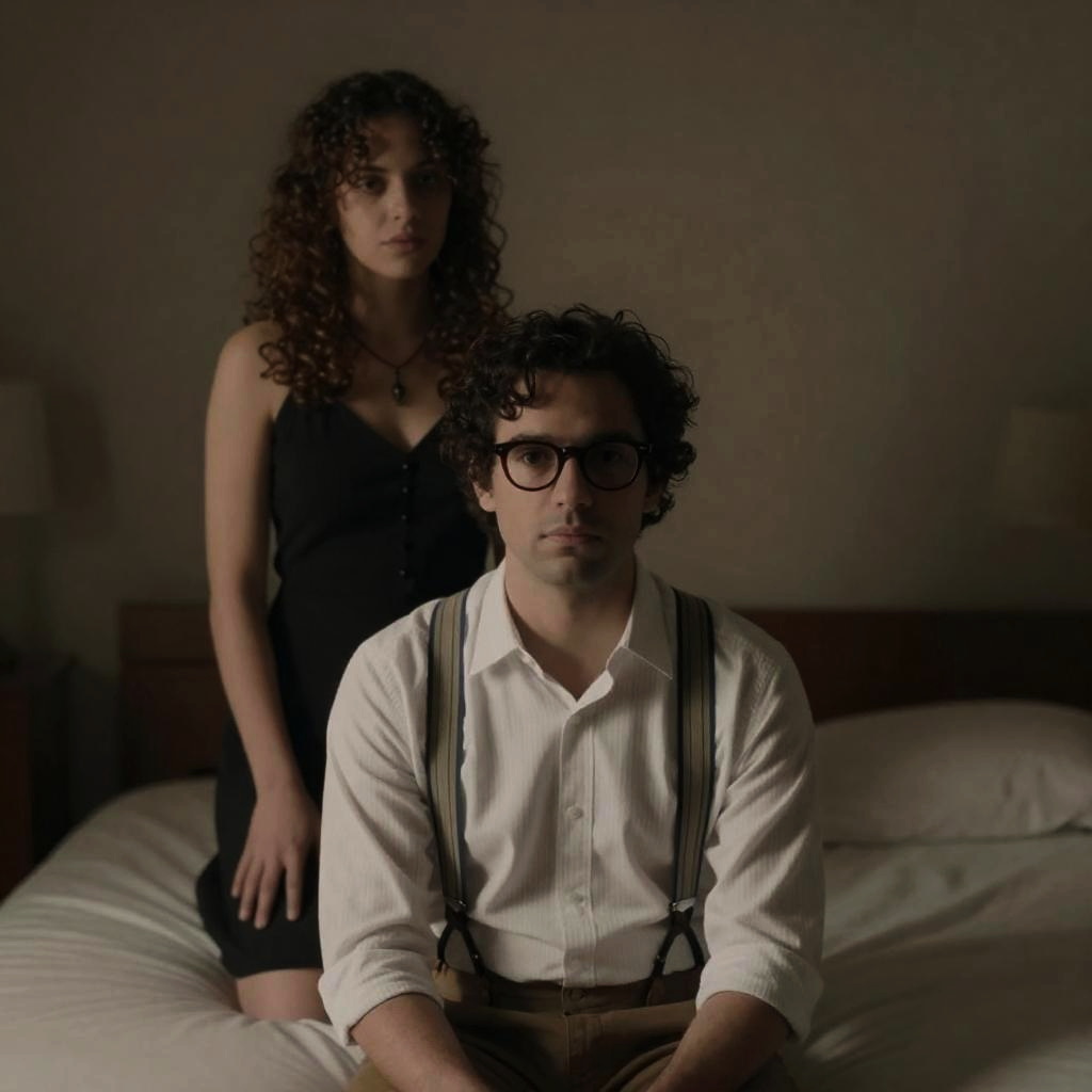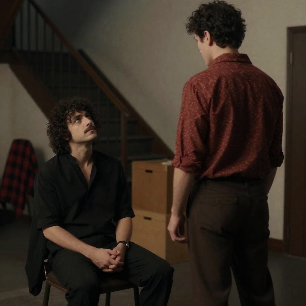 Photograph of two men in a dimly lit room. The man on the left, with curly hair and a mustache, sits on a chair, wearing a black outfit, looking up. The man on the right, with short curly hair, wears a red patterned shirt and brown pants, standing with his back to the camera. Background includes a staircase, wooden boxes, and a plaid garment.