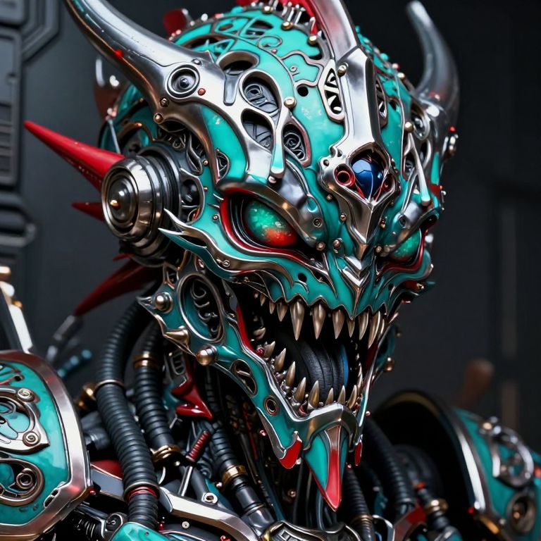 Photorealistic digital artwork of a futuristic, cybernetic, horned monster with glowing green and red eyes, metallic turquoise armor, and sharp,