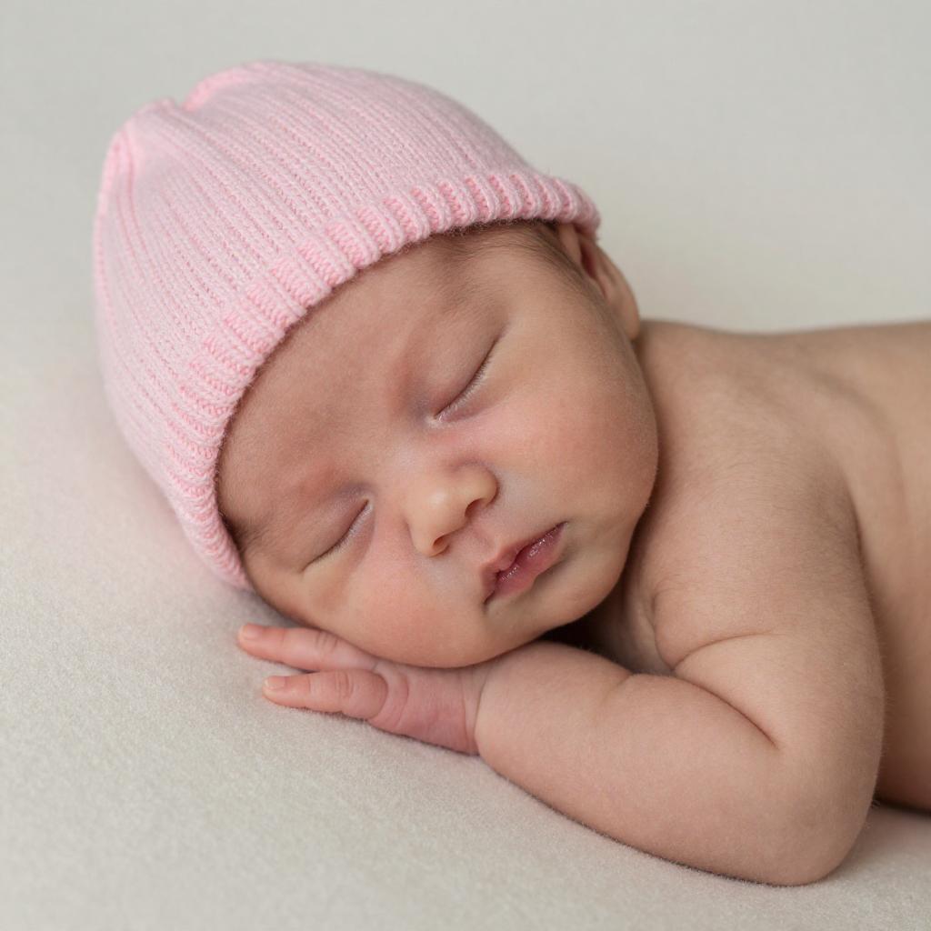Photograph of a sleeping newborn baby with light brown skin, lying on a purple crocheted blanket. The baby wears a matching purple and white striped knitted hat with fluffy pom-poms. The camera angle is slightly above, capturing the baby from the chest up. Soft, even lighting highlights the baby's peaceful expression. The background is slightly blurred, creating a shallow depth of field that keeps the focus on the baby.