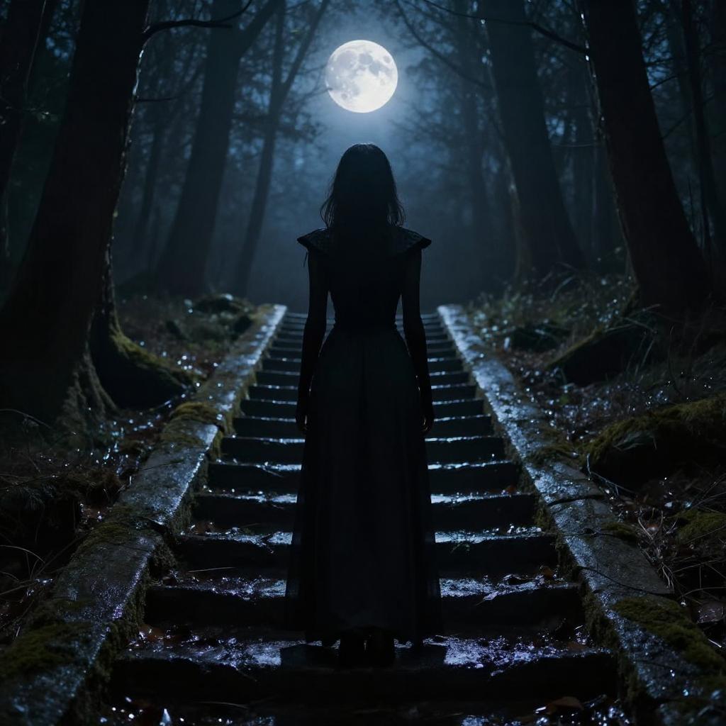 A silhouetted woman wearing a long dress with high shoulders stands on wet stone steps in a dark gothic forest. The scene is illuminated by blue moonlight, creating a dramatic and eerie atmosphere with high contrast and shadowy background. The night setting enhances the mysterious and cinematic feel of the image.