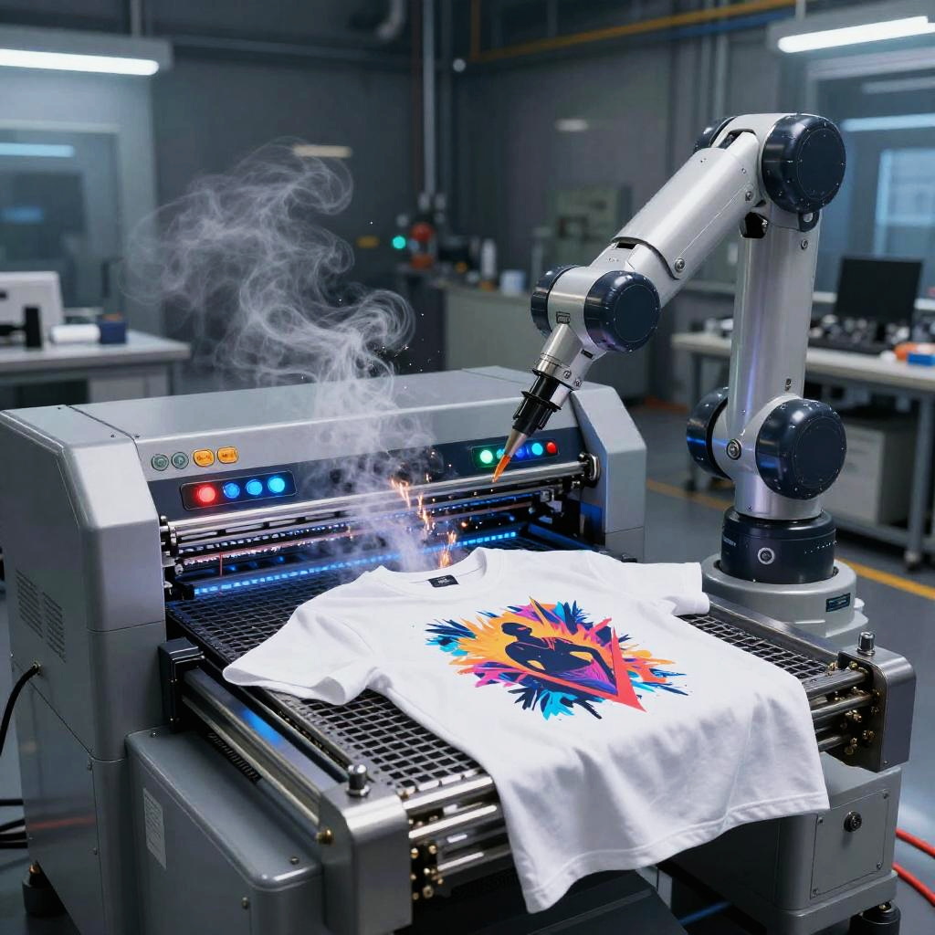 Shirt generator machine, an advanced robotic device producing unique t-shirts with dynamic prints, set in a high-tech factory environment, metallic surfaces, glowing buttons, steam and sparks, cinematic lighting, photo-realistic style