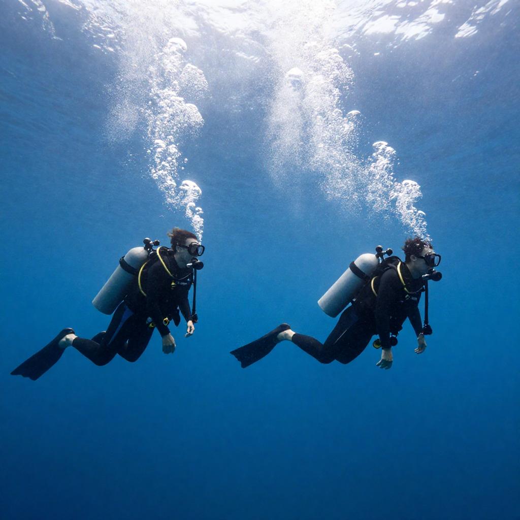 Photograph of two scuba divers underwater, illuminated by bright, white light from above. The divers, wearing black wetsuits and oxygen tanks, are positioned to the left and right, with bubbles surrounding them. The blue, sunlit ocean water creates a dynamic, shimmering effect.
