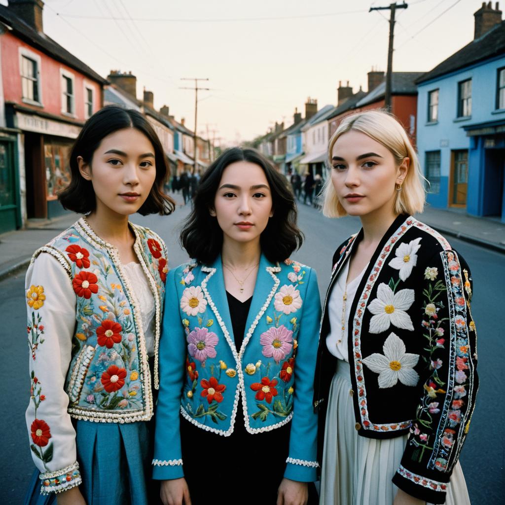 A 1980s fashion professional candid feminist street photograph taken by Mary Ellen Mark and Bruce Davidson and Diane Arbus and Josef Koudelka with an very wide lens - high detailed shot with colour Kodachrome medium format film and flash, fine grain and sharp film, sunrise light chiaroscuro, cute rural portrait of three or four or five people mixed races and genders - asian african european latina, epic, iconic lookalikes of Phoebe Bridgers and Saoirse Ronan and Audrey Tautou and PJ Harvey, wearing bohemian layered jewellery and hypermaximalist portrait, colourful south american village exterior or a wide metropolitan avenue with folklore details, decorated with flowers and huge famous paintings, diamond and metallic accessories, wedding atmosphere, attractive and cute hipster fashion with embroidered or crochet details, no hands visible, traditional vogue modern hairstyle, attractive and fashionable and professionally posing models, insanely detailed and photorealistic faces, f2 bokeh, peacefully and curiously looking at me, hypermaximalist portrait, elegant and appealing.