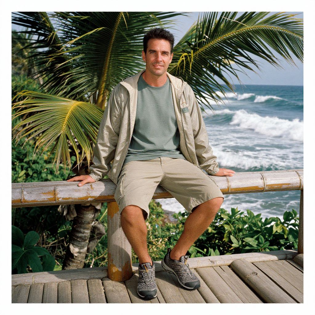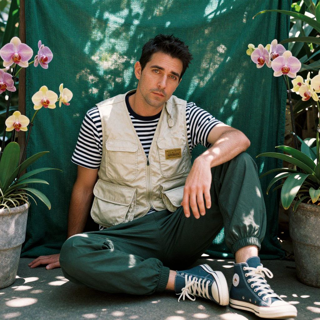 A man, olive green sherpa hoodie, black jogger sweatpants, gray athletic trainers, lounging in dense tropical foliage, vibrant bird calls, technicolor film stock, relaxed expression. Man has masculine face and piercing eyes