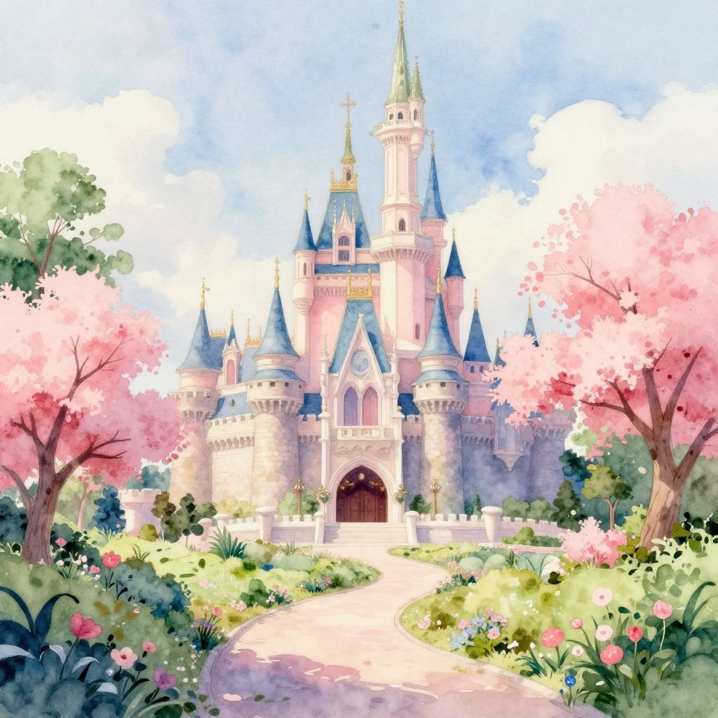 Digital illustration of a fairy-tale scene with a red-and-blue striped circus tent, pink cherry blossoms, and a grand castle in the background,