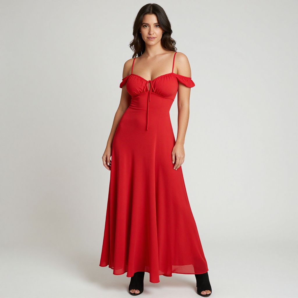 "Woman, bohemian, floor-length dress in vibrant red, thin spaghetti straps with off-shoulder details, sweetheart neckline with a drawstring, fitted bodice, flowing skirt, peep-toe black ankle booties, plain white studio background.. Sexy. Pretty face and beаutiful eyes. Big breasts."