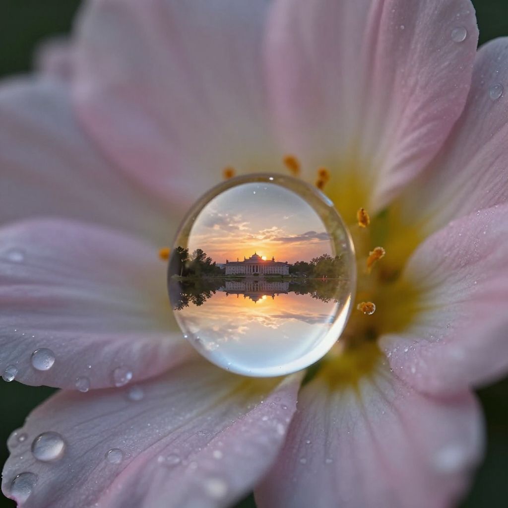 Score_9, score_8_up, score_7_up, score_6_up, score_5_up, score_4_up, Single dew drop on a flower, reflecting a palace, sunrise, 32k uhd, realistic view, 16k resolution photorealistic, masterpiece, breathtaking intricate details, realistic and lifelike cgi, dramatic natural lighting, reflective catchlights, high quality CGI VFX fine art